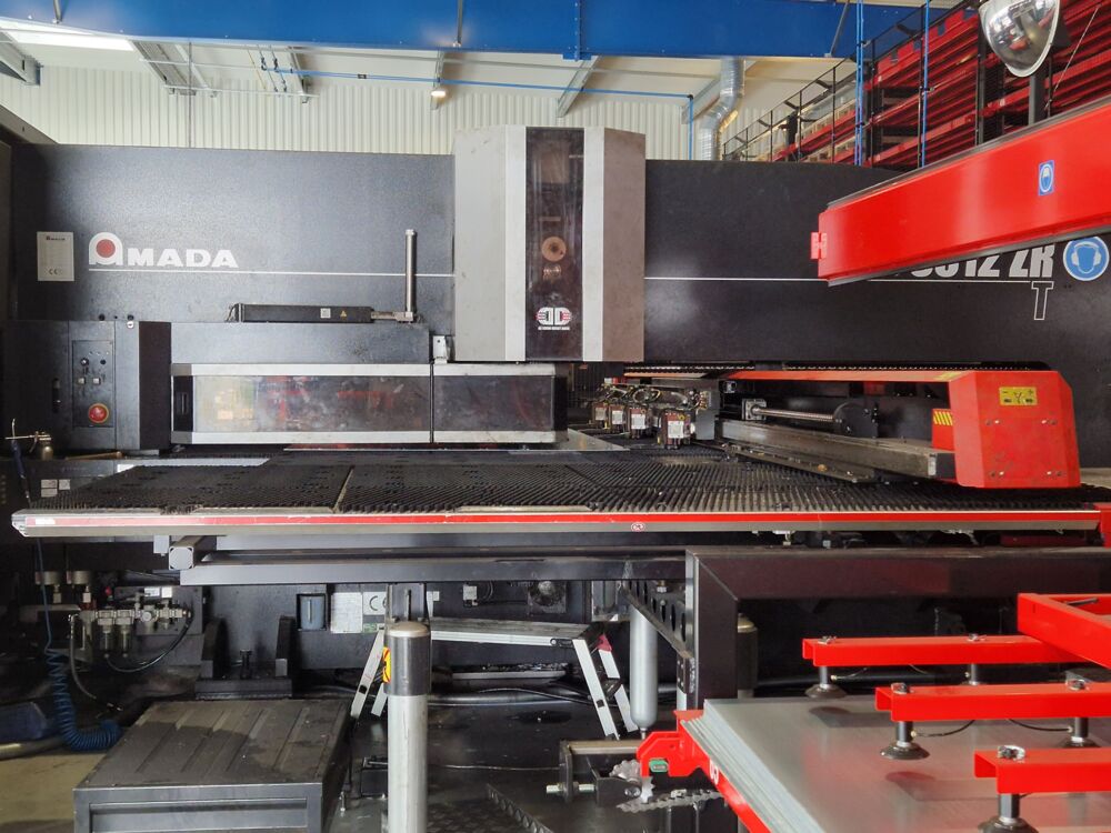 - Une poinçonneuse automatisée avec un magasin de 300 poinçons et 600 matrices d’une capacité de 1500*3000 reliée au transtockeur central de l’atelier.